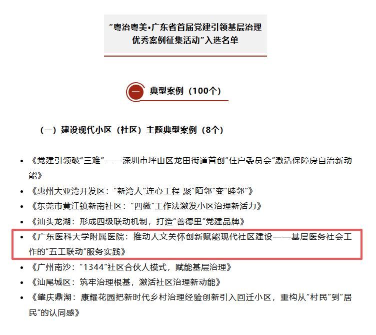 近日,由中共广东省委社会工作部与南方日报、南方+客户端联合开展“粤治粤美·广东省首届党建引领基层治理优秀案例征集活动”评选结果出炉,永利集团申报的《304am永利集团官网附属医院:推动人文关怀创新赋能现代社区建设——基层医务社会工作的“五工联动”服务实践》入选典型案例。