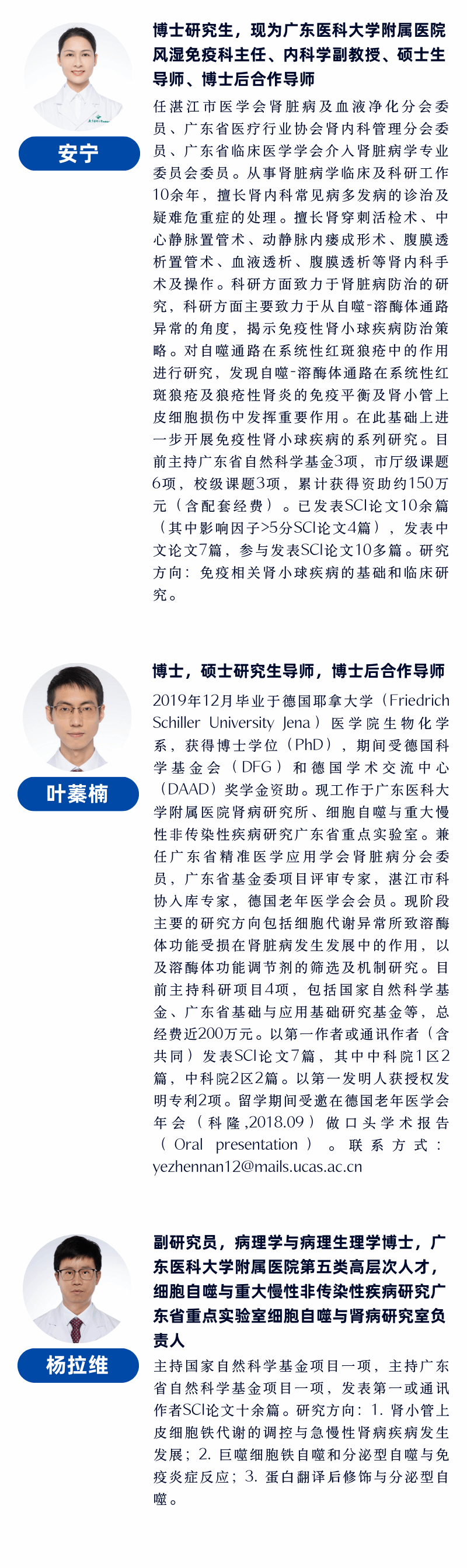 团队依托基础和临床两大平台。其中基础研究方向依托省市共建细胞自噬与重大慢性非传染性疾病研究广东省重点实验室;临床方向所依托的肾病科获评国家临床重点专科建设单位和国家中西医协同 “旗舰” 科室,并牵头在粤西地区建成市-县-镇三级联动的尿毒症防控网络,显著提升该区域 CKD 防治水平。