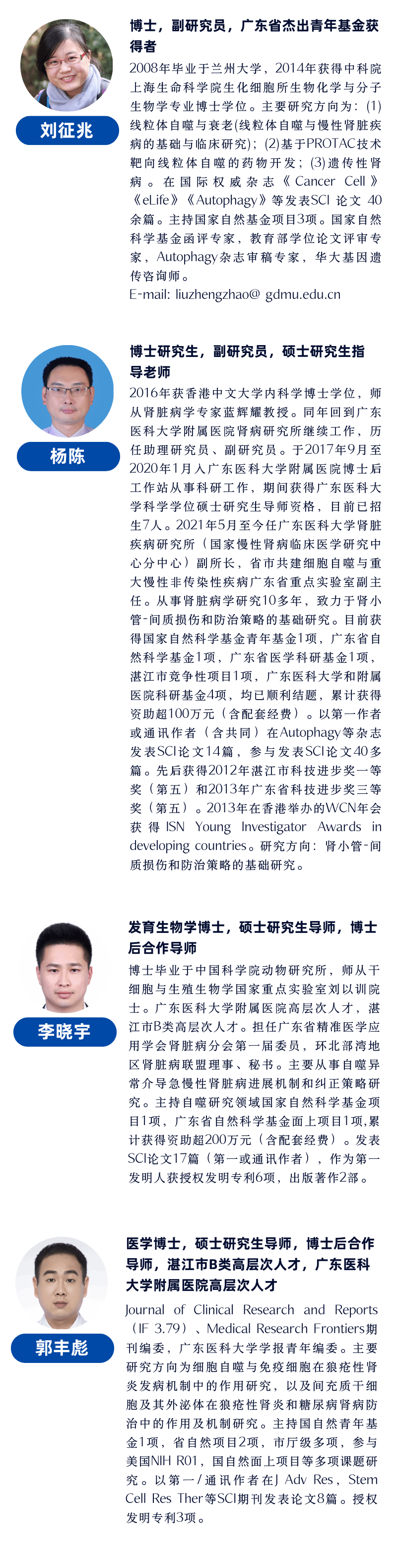 目前团队现有固定人员55名,其中专职科研人员41名,技术管理人员7名。博士研究生指导老师15名,硕士研究生指导老师29名;国务院政府特殊津贴专家1名、广东省杰出青年基金获得者1人,广东特支计划”青年拔尖人才1人。团队带头人刘华锋教授是国务院政府特殊津贴获得者、中国病理生理学会肾脏病专委会副主任委员、广东省A类人才,刘征兆博士是广东省杰青获得者;王鹏博士于2024年获批“广东特支计划”青年拔尖人才。