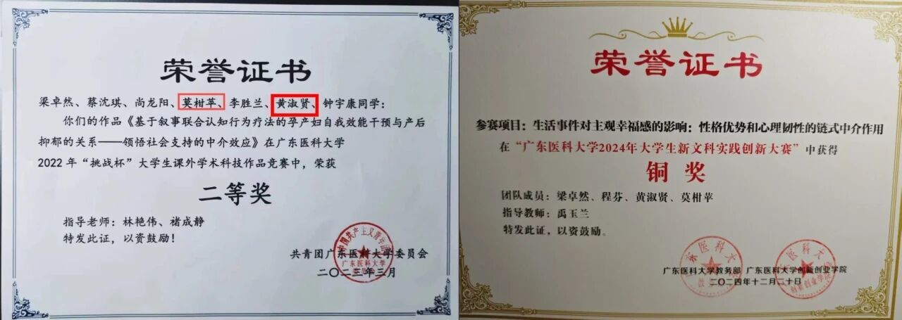 课余时间,宿舍积极参与各类科研学术竞赛,提升综合素质。宿舍四人积极参与科研项目,获院本科生科研项目重点立项;莫柑苹和黄淑贤积极参加挑战杯比赛,获得第十七届“挑战杯”广东大学生课外学术科技作品竞赛三等奖、304am永利集团官网大学生新文科实践创新大赛铜奖等奖项;方妙旋作为项目成员,获大学生创新创业训练计划项目省级立项。