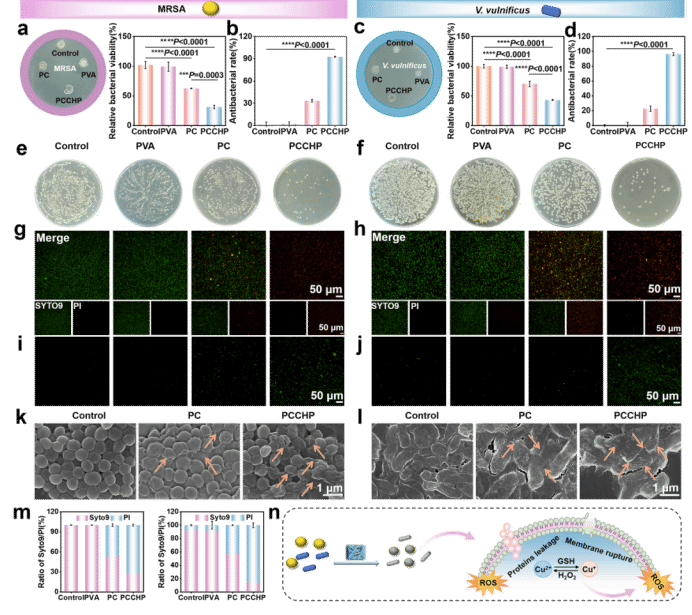 创伤弧菌(V. vulnificus)是一种高致病性的机会性海洋细菌,是导致人类致命性败血症的原因,给医疗保健带来巨大经济负担。创伤弧菌利用各种毒力因子包括生物被膜相关因子和外毒素,在自然环境中持续存在并在感染过程中发挥致病作用。其中,皮肤创面是诱发创伤弧菌引发败血症的关键因素。前期研究工作,我们合理设计和制备了掺杂二氧化铈纳米颗粒和环丙沙星的明胶微针,其具有广谱抗菌活性和抗氧化活性,并能够有效杀灭创伤弧菌、清除伤口活性氧、促进细胞增殖,继而加速感染创面修复。《A gelatin microneedles featuring antibacterial and reactive oxygen species scavenging properties for treating Vibrio vulnificus-infected wounds》 International Journal of Biological Macromolecules 309 (2025) 142640)(中科院二区Top期刊,影响因子8.5),该项研究工作中2022级硕士研究生舒玉玲和戚怡博士为共同第一作者。