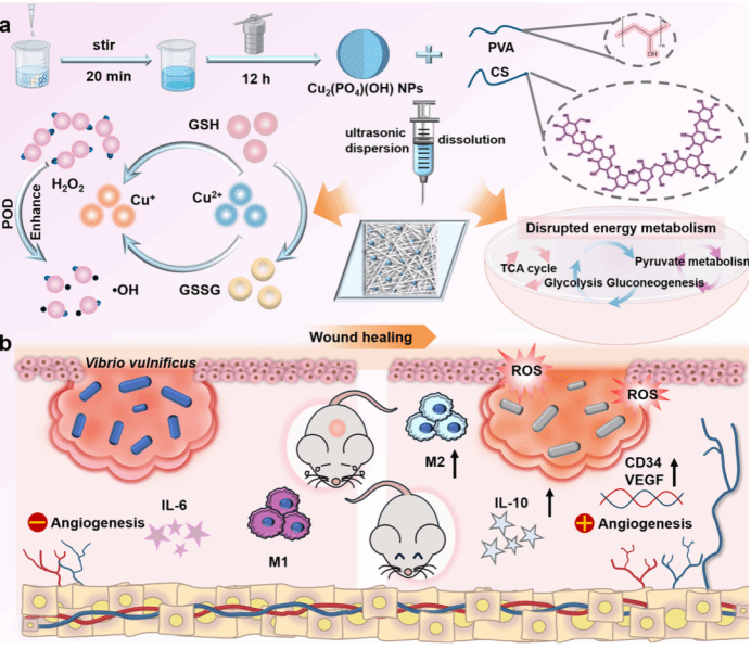 图 1.纳米纤维膜的制备过程及其促进创伤弧菌感染伤口愈合的作用机制