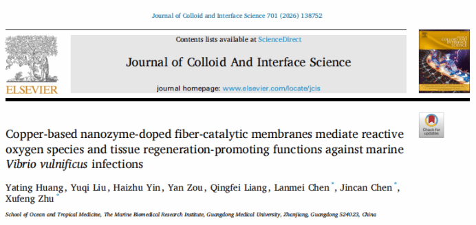 近日,永利集团海洋与热带医学学院朱旭峰/陈锦灿/陈兰美团队在《Journal of Colloid And Interface Science》(中科院一区Top期刊,影响因子 9.7)发表了题为“Copper-based nanozyme-doped fiber-catalytic membranes mediate reactive oxygen species and tissue regeneration-promoting functions against marine Vibrio vulnificus infections”的研究论文。本工作以创伤弧菌为研究对象, 设计开发了一种抗菌和促修复的多功能纳米催化膜,用于治疗创伤弧菌感染创面。
