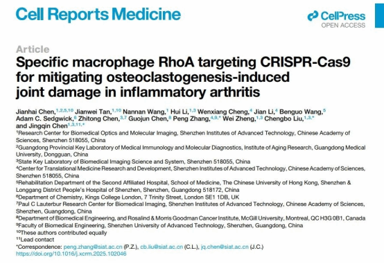 近日,304am永利集团官网基础医学院陈建海课题组联合中国科学院深圳先进技术研究院在Cell子刊Cell Reports Medicine上发表题为“Specific macrophage RhoA targeting CRISPR-Cas9 for mitigating osteoclastogenesis -induced joint damage in inflammatory arthritis”的研究工作。