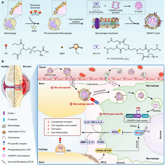 类风湿关节炎是一种常见自身免疫疾病,免疫系统会攻击健康的关节组织,标志性特征为关节滑膜炎和关节骨破坏。当炎症因子过度表达引起炎症细胞大量浸入关节,触发滑膜炎症并导致血管翳形成,进一步侵蚀软骨及骨组织,导致不可逆的关节损伤,中晚期致残率高达60%-70%。关节滑膜巨噬细胞是一把“双刃剑”,既是“破坏者”:促炎、破骨;也是“消防员”:抗炎和促进成骨生成。类风湿关节炎存在免疫失衡,刺激诱导巨噬细胞向破坏者角色转化,驱动疾病恶性发展。因此,如何精准阻止或逆转滑膜巨噬细胞的不利转化,是类风湿关节炎诊疗领域的前沿热点课题,然而由于缺乏对滑膜巨噬细胞特异识别和调控手段,而面临巨大挑战。