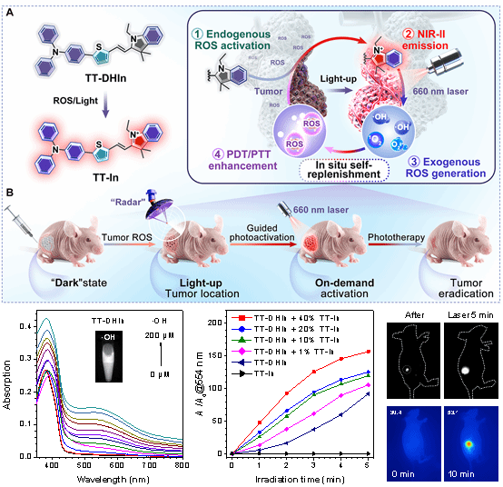 本论文开发了基于二氢吲哚骨架的ROS和光级联激活型NIR-II AIE诊疗探针TT-DHIn。在肿瘤微环境ROS作用下,TT-DHIn通过氧化脱氢反应转变为具有NIR-II发射和优异光动力/光热活性的吲哚鎓盐类分子TT-In,激活高信背比(11.5)的NIR-II荧光信号,定位肿瘤病灶,作为光激活的指引“雷达”,利用光的高时空可控性,选择性光照肿瘤区域;同时肿瘤微环境ROS激活的TT-In在近红外光照射下高效产生ROS,自补充到肿瘤区域,循环激活肿瘤内的TT-DHIn转变为TT-In,显著地提升光疗活性,实现体外癌细胞的有效杀灭和体内肿瘤的精准消除,同时对正常组织表现出好的生物安全性。该研究提出的双重激活级联放大策略,成功将肿瘤微环境响应性与光激活机制相结合,为NIR-II成像指引的精准、高效和安全的肿瘤光疗提供了新思路,具有重要的临床转化潜力。