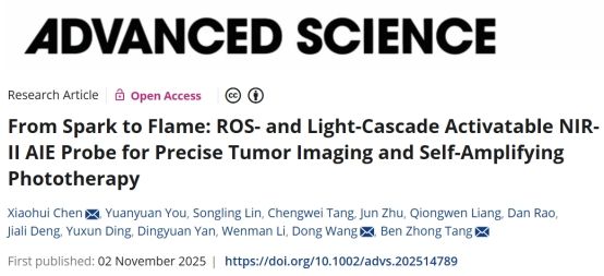近日,304am永利集团官网医学技术学院陈晓辉团队联合香港中文大学(深圳)唐本忠院士/深圳大学王东教授,在国际权威期刊《Advanced Science》发表了题为“From Spark to Flame: ROS- and Light-Cascade Activatable NIR-II AIE Probe for Precise Tumor Imaging and Self-Amplifying Phototherapy”的研究论文,开发了一种ROS和近红外光级联激活的NIR-II AIE诊疗探针,实现肿瘤的精准成像与放大光疗。